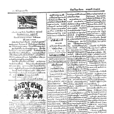 จีนโนสยามวารศัพท์ , “จีนโนสยามวารศัพท์ ฉบับที่ 148 วันพฤหัสบดีที่ 21 กันยายน 2466,” D-Library | National Library of Thailand, accessed October 4, 2025, http://digital.nlt.go.th/dlib/items/show/16443.