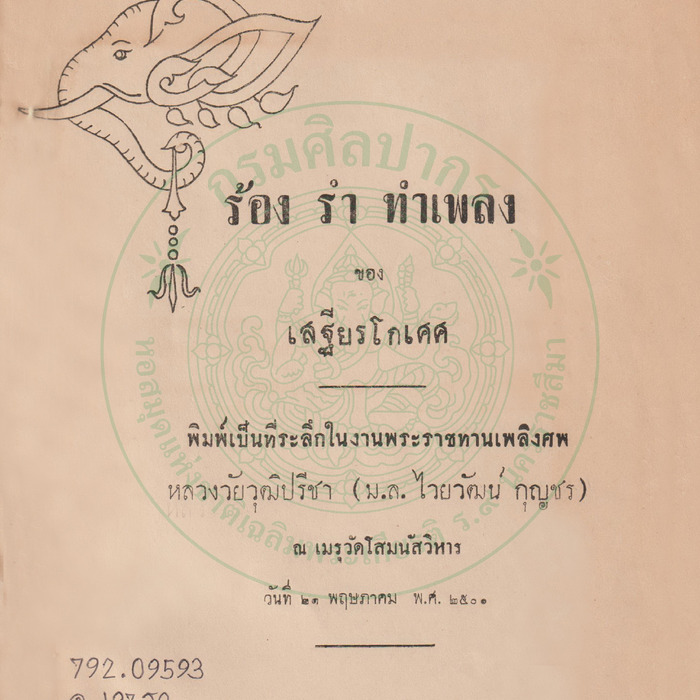 พิมพ์ในงานพระราชทานเพลิงศพ หลวงวัยวุฒิปรีชา (ม.ล. ไวยวัฒน์ กุญชร) ณ เมรุวัดโสมนัสวิหาร วันที่ 21 พฤษภาคม พ.ศ. 2501